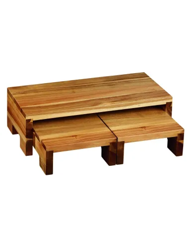 Este lote de 3 alzadores de acacia Pro.mundi permite organizar eficazmente buffets y presentaciones con diferentes alturas. Fabricados en madera robusta, son fáciles de limpiar, se encajan para un almacenamiento práctico y son adecuados para diversos eventos profesionales, mejorando la visibilidad y la circulación de los productos.