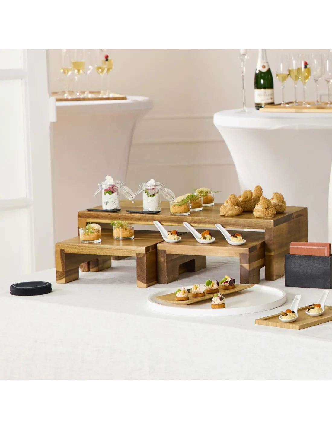 Lote de 3 alzas de acacia Pro.mundi, fabricadas en madera robusta, permiten organizar buffets y presentaciones a diferentes alturas. Fáciles de limpiar y apilables para un almacenamiento...