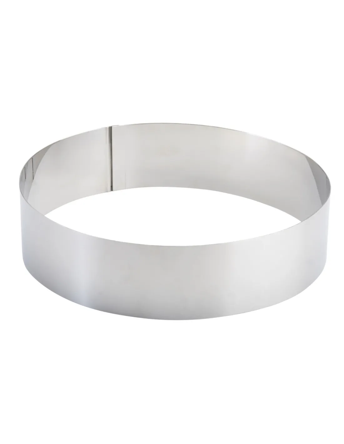 Altura adecuada para alternar capas de masa de bizcocho, merengues y helado al preparar un vacherin. Aro de acero inoxidable sin revestimiento, diámetro de 24 cm y altura de 6 cm.