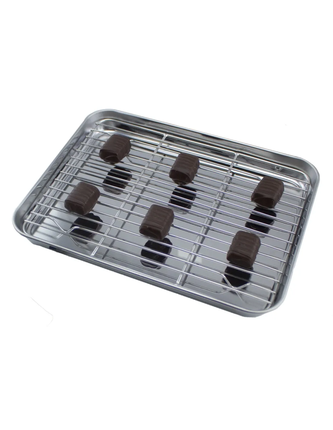 La bandeja para emplatar con rejilla de inox, con medidas de 26x18,5 cm, facilita el recubrimiento de alimentos con salsas o chocolate y permite escurrir el exceso de grasa.