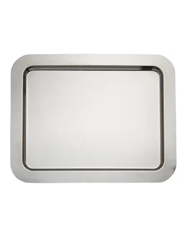 Bandeja de acero inoxidable con bordes planos, dimensiones de 40x32 cm. Diseñada para uso en recepciones y eventos.