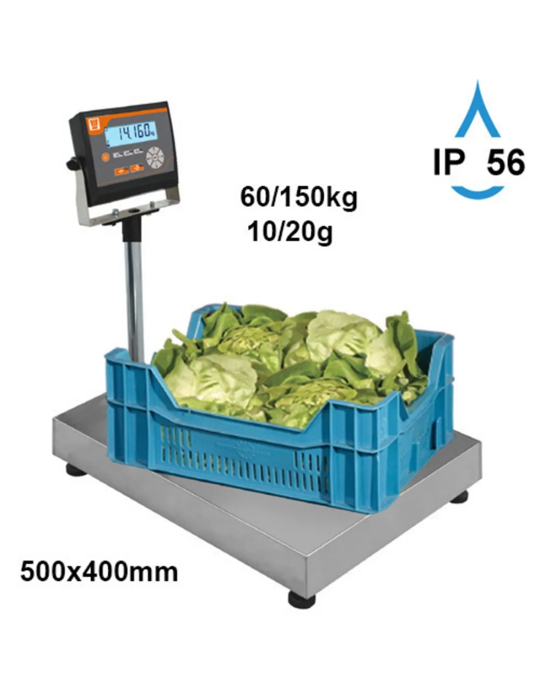 Báscula de recepción IP56, estructura de acero epoxi, plato inox, batería 70h, alimentación desmontable. Función pesaje, tara, 20 memorias, recuento, control, salida RS232, soportes murales y columna inox. Precisión : 10g hasta 60kg, 20g hasta 150kg.