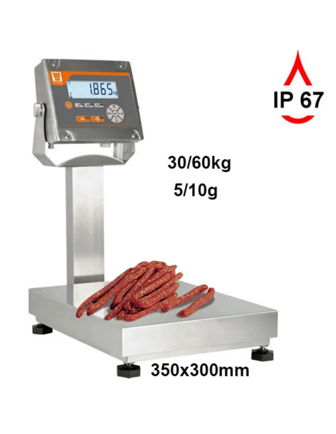 Balanza de acero inoxidable para ambientes húmedos con gran pantalla LCD retroiluminada azul (2,5 cm). Funciona a red y con batería recargable (70h de autonomía). Se entrega con columna y soporte mural de acero inoxidable. Pesaje, tara, 20 memorias de tara, conteo, totalización de pesadas, control +/-, salida RS232 para PC/impresora.