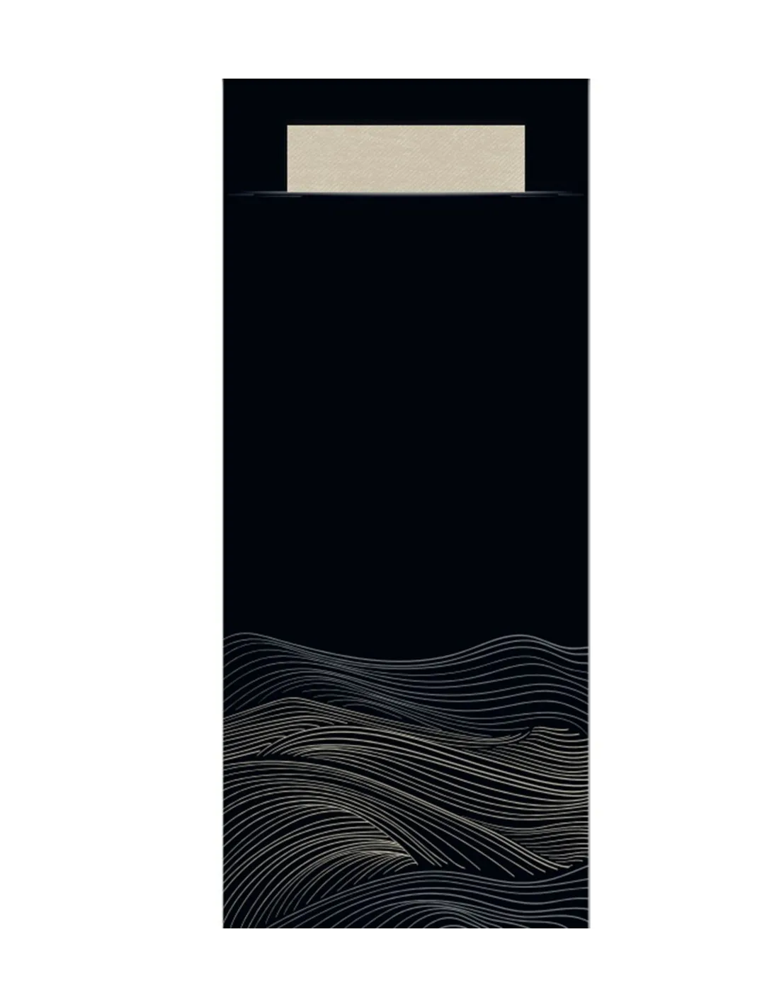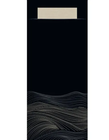 Bolsa de papel negra de 20x10 cm que incluye una servilleta doble punto de 39x39 cm, plegada en 8. Facilita el montaje de mesas en terrazas. Diseño funcional y higiénico. Presentada en caja...