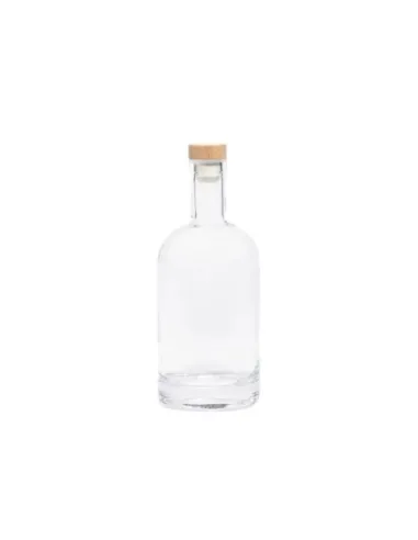 Botella de vidrio transparente de 75 cl de la gama Aqualis, con 23,5 cm de altura, 9,3 cm de diámetro y un peso de 710 g. Incluye tapón de madera y es apta para lavavajillas, diseñada para uso...