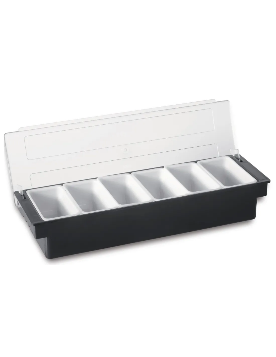 Caja para especias de plástico negro, dimensiones 49x16x11 cm, con 6 compartimentos extraíbles. Fabricada en ABS con tapa de plástico.