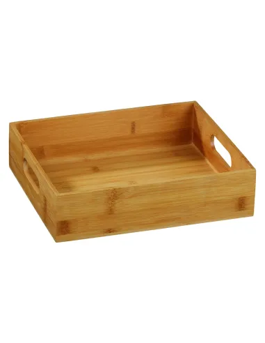 Caja de bambú natural de 30 x 25 x 7,5 cm, diseñada para organizar espacios en buffet o mostrador. Con asas integradas, es apilable, ligera y fácil de mantener, adecuada para profesionales de la...