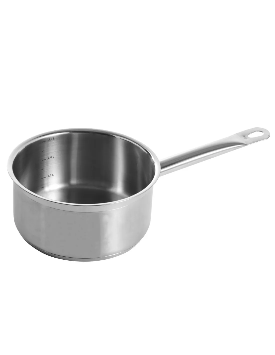 En acero inoxidable que ofrece una excelente resistencia a la corrosión y a los ácidos alimentarios. Fondo encapsulado (inox - aluminio - inox) permite una difusión óptima del calor. Acabado interior y exterior pulido satinado, con un reborde pulido espejo. El interior de cada unidad está graduado para mayor precisión. Borde vertedor. Mangos atérmicos de tubo de inox y anclajes de inox soldados muy resistentes. Tapas apilables y fáciles de guardar. Mantenimiento fácil gracias a los ángulos redondeados.