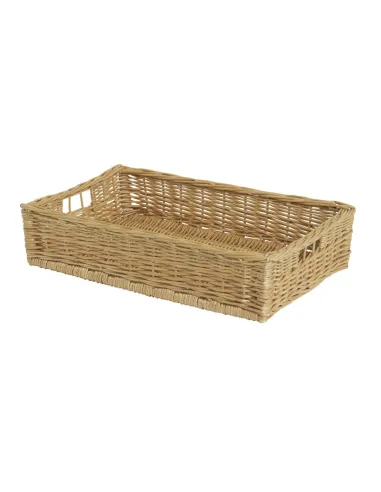 Cesta rectangular de mimbre de 60x39x13 cm, diseñada para el transporte y presentación de bollería y diversos tipos de panes.