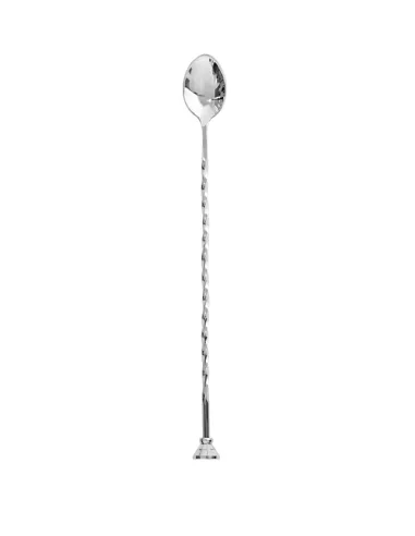Cuchara de mezcla de 28 cm, fabricada en acero inoxidable, con mango trenzado y machacador integrado, diseñada para mezclar cócteles de manera eficiente.