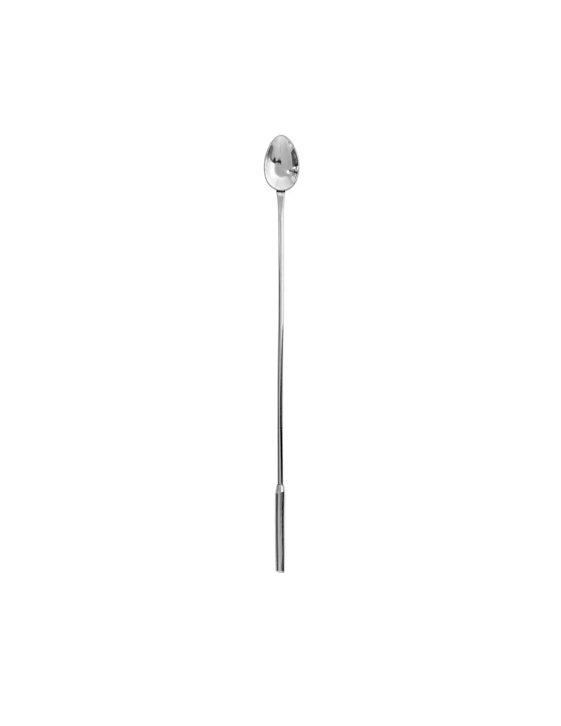 Cuchara de cóctel de 32 cm con mango que finaliza en un machacador, diseñada para mezclar cócteles de manera eficiente.