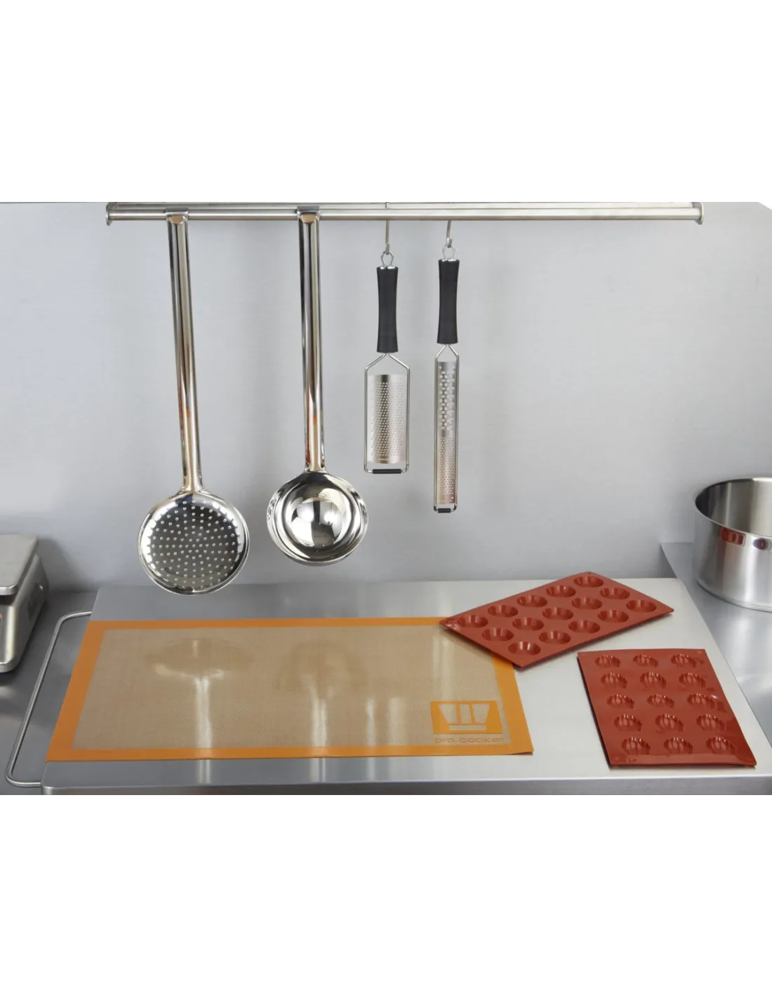 Espesor de 2,5 a 3 mm según el tamaño. Capacidad y diámetro indicados en el mango. Incluye gancho de suspensión. Mango curvado para mayor robustez.