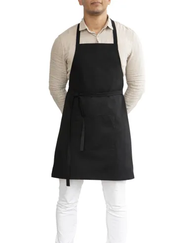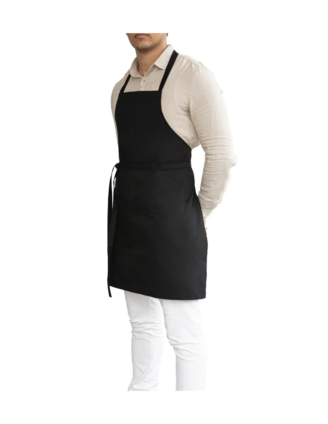 Delantal con peto negro unisex de talla única, modelo Bistro. Cuenta con cintas largas para anudar al frente y un bolsillo delantero para mayor funcionalidad.