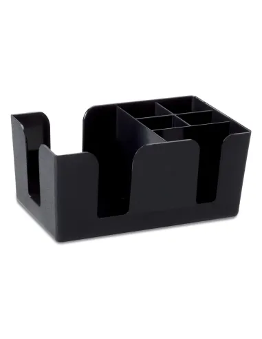 Black plastic sturdy accessories holder, measuring 10.5 cm, designed with separate compartments to store straws, cocktail stirrers, napkins, cocktail decorations, and soda spoons.