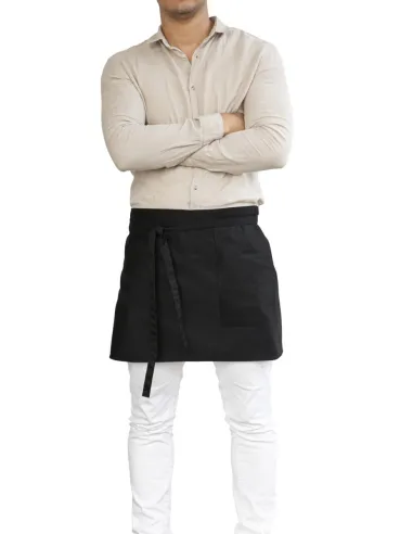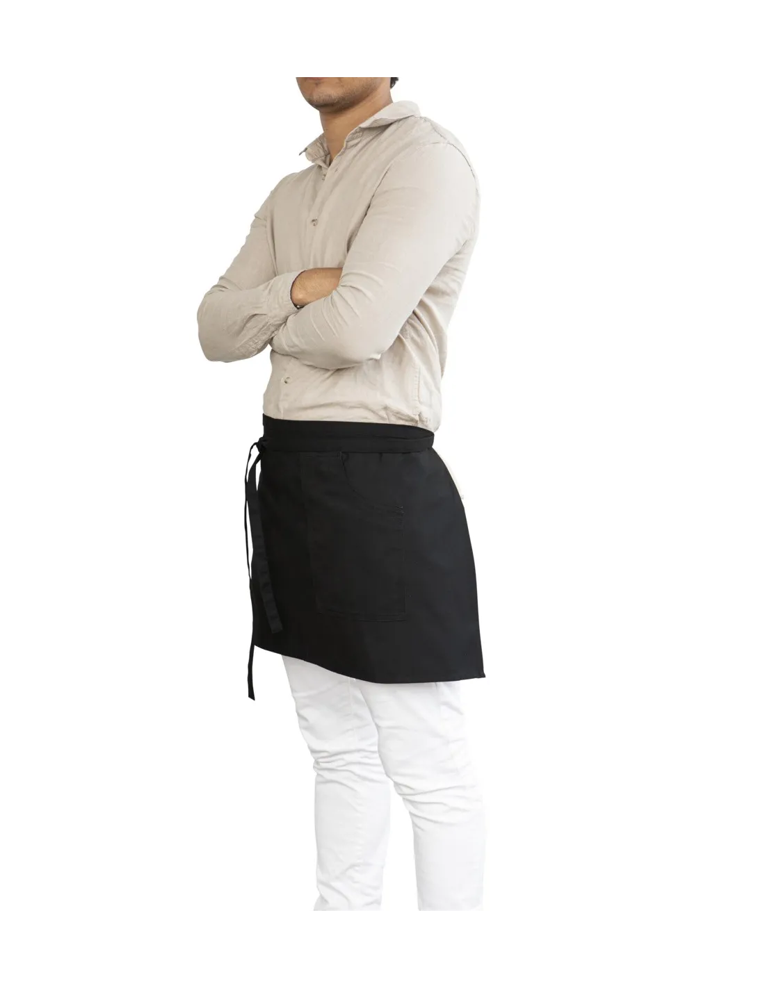 Black unisex Bistro short apron from Pro.mundi, one size fits all. It features long ties to knot at the front and a front pocket for added functionality.