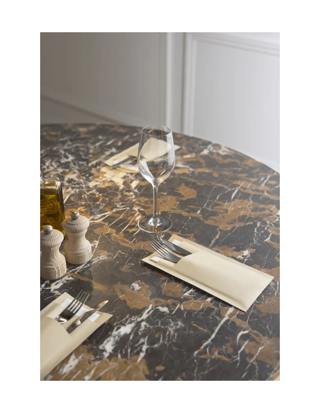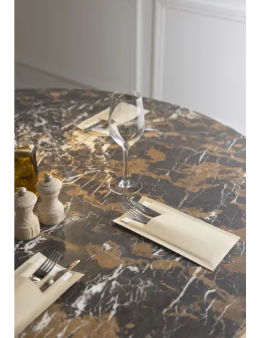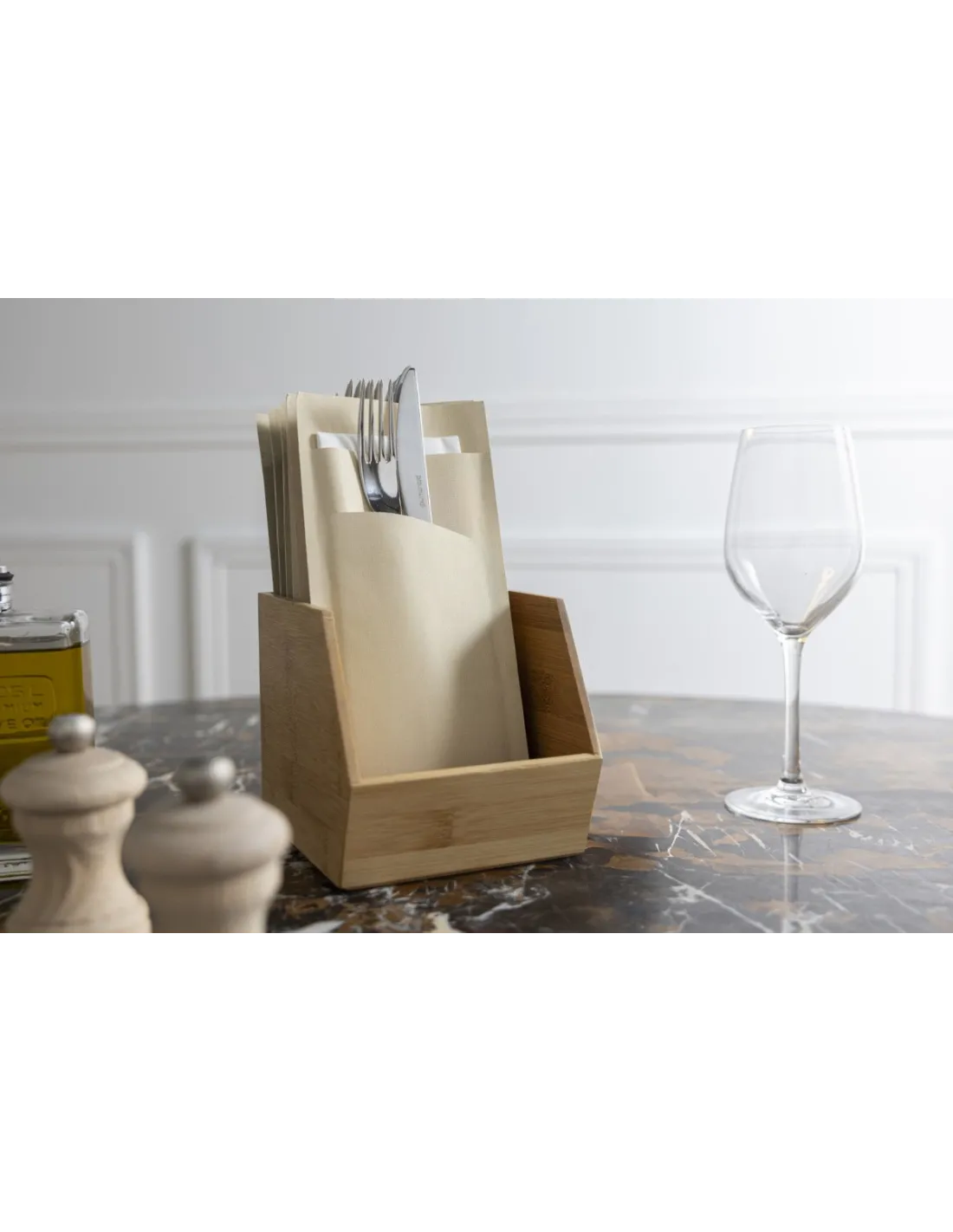 Kraft paper bag measuring 23.5 x 11.5 cm, includes non-woven napkin measuring 30 x 39 cm (50 g/m²). Facilitates table setup on terraces. Functional and hygienic design, presented in a dispenser...