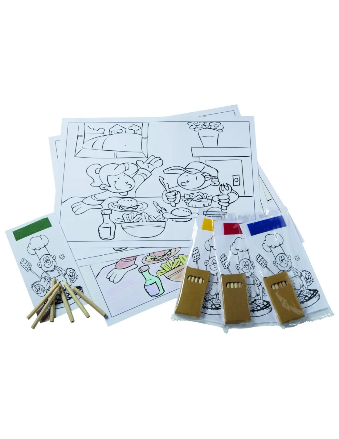 Children's coloring case that includes a napkin (available in 4 colors) and 6 colored pencils, as well as a coloring set.