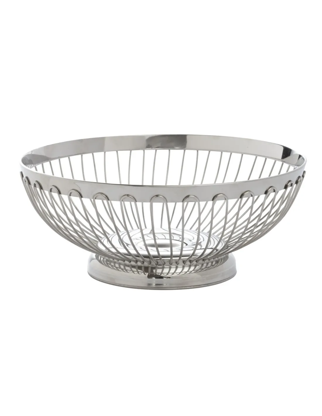 Round stainless steel basket with a diameter of 17 cm and a height of 7.6 cm, suitable for bread or fruit in restaurant settings. Its shiny finish and perforated design offer durability and easy...