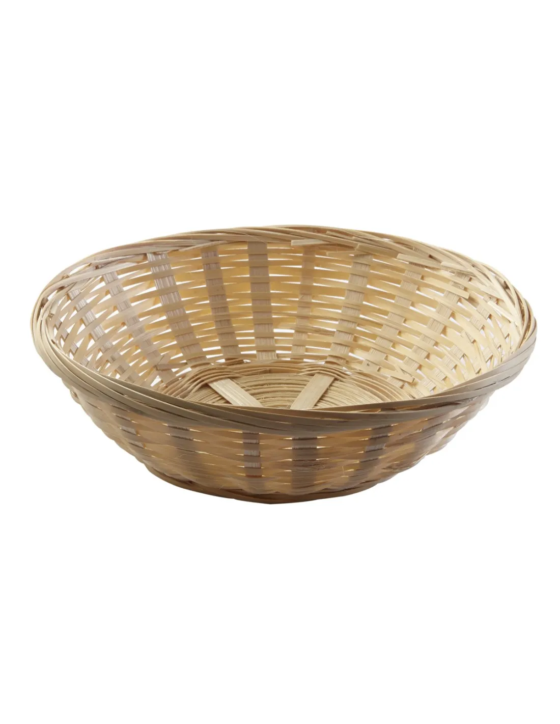 Round woven bamboo basket with a diameter of 15 cm and a height of 6 cm. Its stackable and lightweight design allows for presenting bread, fruits, or pastries in professional settings, optimizing...