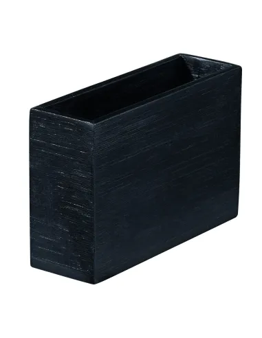 The product description is as follows: The rectangular bamboo container Pro.mundi, dimensions 12 x 4 x 8 cm, is designed for organizing small items in buffets, counters, or service tables. Its compact format allows for the efficient arrangement of cocktail napkins, stirrers, packets, toothpicks, or single-dose items without taking up workspace. Its elongated shape provides quick access to the contents and optimizes visibility in service areas. The black finish provides a sober presentation suitable for contemporary environments in professional buffets. Made of dyed bamboo, this container is stable, lightweight, and suitable for frequent use in HORECA environments. Maintenance is quick: a damp sponge is sufficient for daily cleaning. In case of residues, a little white vinegar helps degrease without altering the color. This Pro.mundi container is a functional accessory designed for professionals seeking a discreet and effective solution to structure their service spaces.