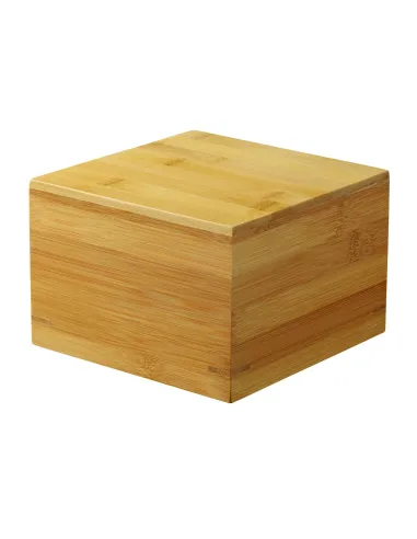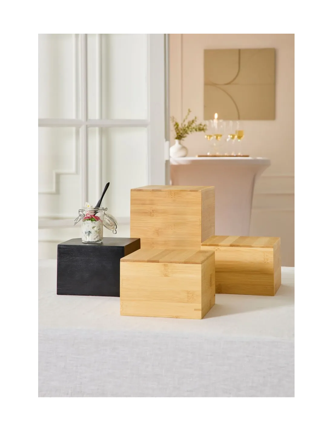 The 15 x 15 x 10 cm cubic elevator Pro.mundi is designed to optimize the arrangement of buffets in professional catering. Its natural bamboo structure provides reliable stability for showcasing dishes or containers, while allowing for a variety of heights adapted to space limitations. This compact stand can be used as an elevator or as a versatile container for service items such as napkins or presentation accessories. Ideal for breakfast buffets, brunches, cocktails, or receptions, it fits into all types of mobile or fixed configurations. Its raw material design makes maintenance easy in a professional environment: just wipe with a damp sponge and dry. In case of contact with greases, white vinegar can be used for degreasing without altering the stand. This product has been designed to meet the efficiency and speed requirements in high-rotation service areas. The 15 x 15 x 10 cm format allows for easy handling and optimized storage. It is compatible with other modules in the same range to create modular setups according to the type of offer or available space. Its simple and uniform finish ensures a professional visual coherence on all types of surfaces. Recommended for intensive use in hotel buffets, event catering, or institutional catering, this elevator is a functional tool to structure presentation areas and enhance the visibility of the products offered. Its compact size also allows for use in small spaces without compromising service aesthetics. The Pro.mundi elevator is an accessory designed for HORECA professionals seeking a reliable, durable, and easy-to-maintain solution.