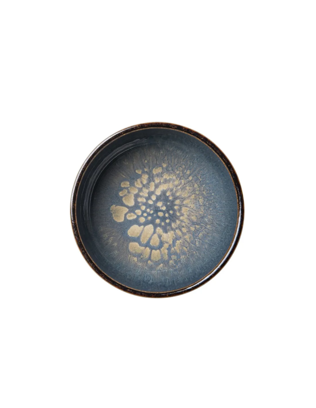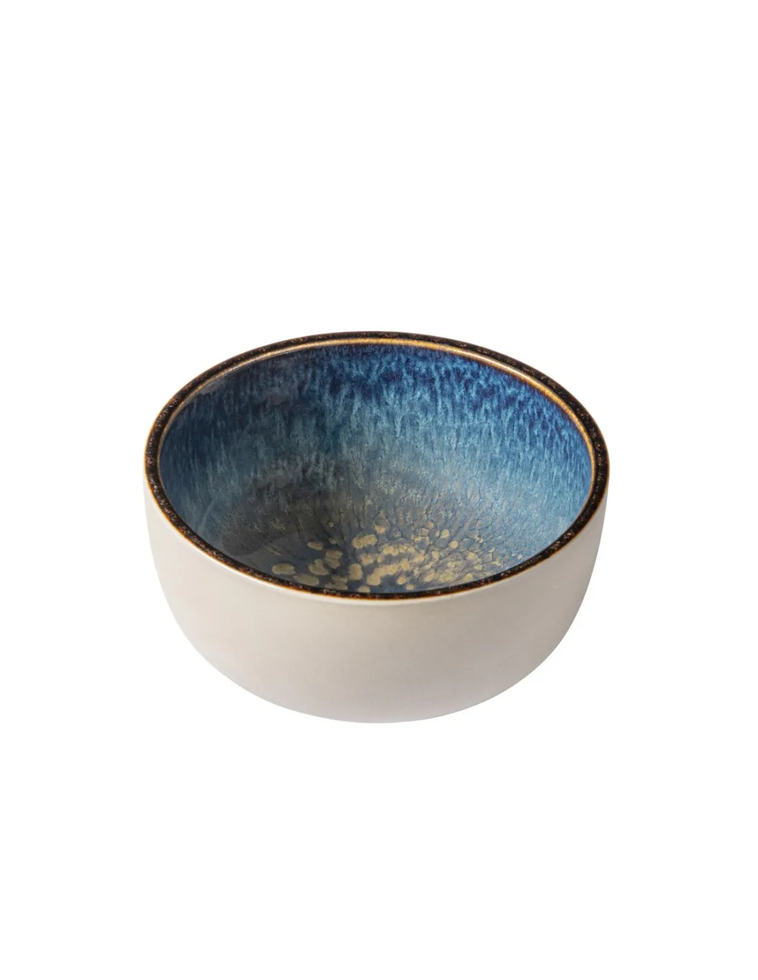Porcelain round bowl, 12 cm in diameter, microwave and dishwasher safe. Its design features a matte clay exterior finish and a deep blue interior with brown accents. Ideal for serving small...