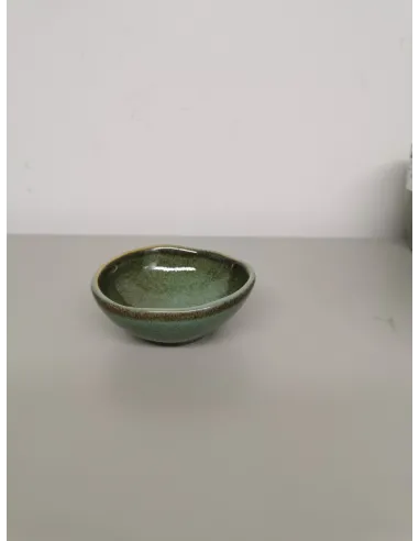Round organic glazed stoneware bowl in green, with a diameter of 8.3 cm. It offers high resistance to thermal shocks, easy cleaning, and a unique organic design, suitable for serving small...