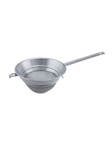 Chinese strainer without stainless steel reinforcement, with a diameter of 20 cm and a height of 14 cm. Mesh of 0.4 mm, suitable for straining sauces, jellies, and coulis.