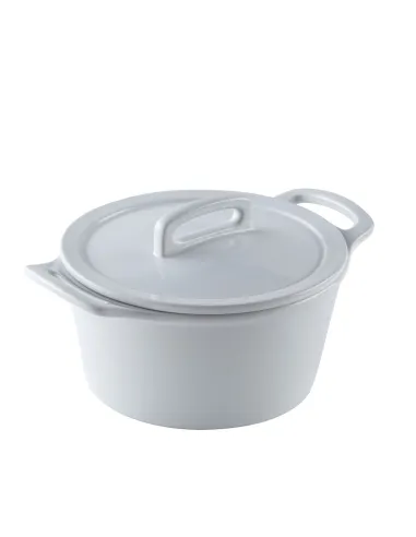 Round white porcelain cocotte, 17 cm in diameter, designed for professional catering. It can withstand temperatures up to 200 °C, is dishwasher safe, and its size is suitable for cooking or...