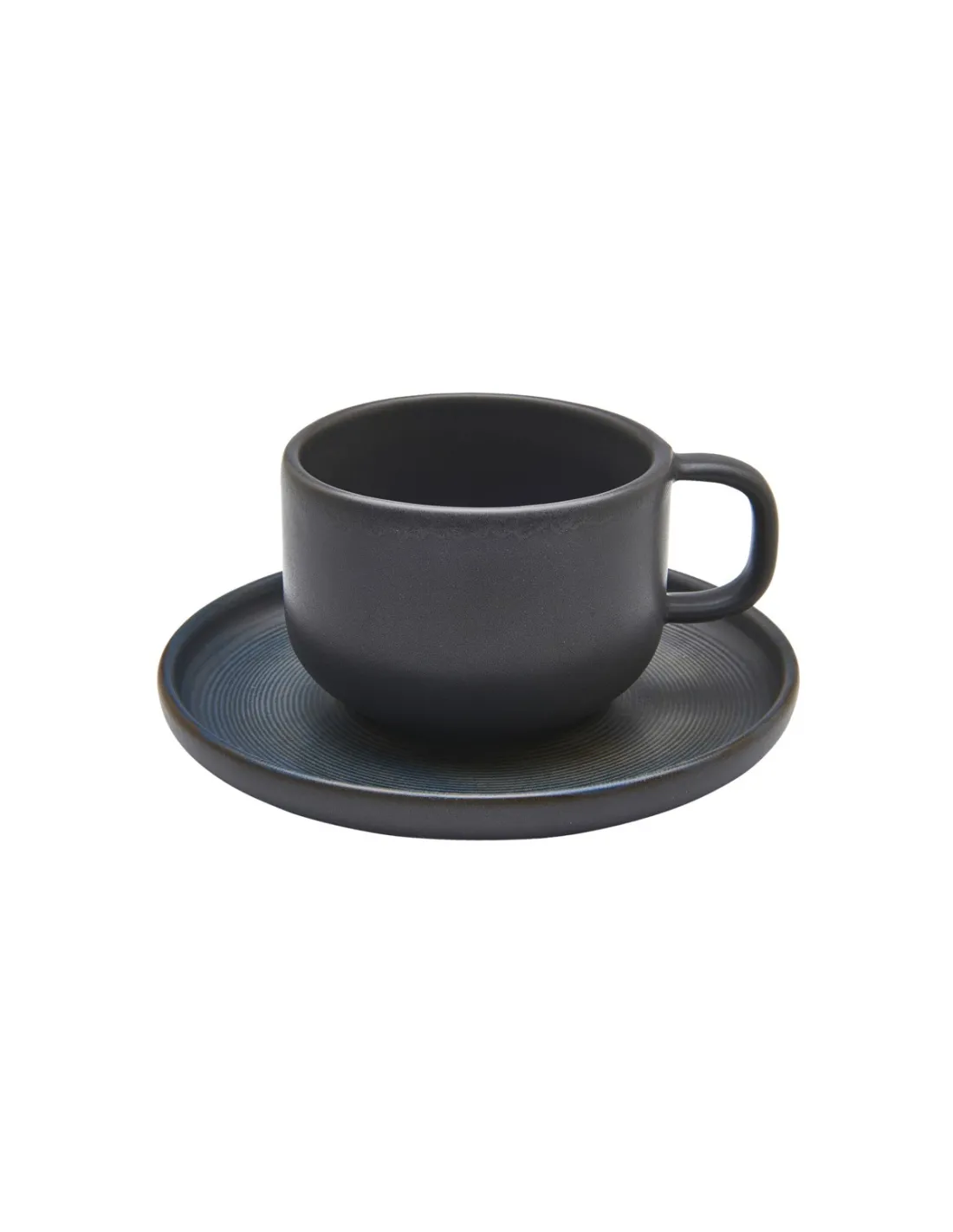 The round glazed stoneware tea cup has a capacity of 21 cl and a diameter of 8.5 cm, offering durability and thermal resistance. Its design features concentric reliefs and a golden swirl....