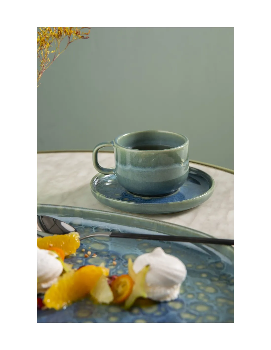 The particularity of this cup lies in its glazed stoneware construction, which offers natural resistance to impacts and durability suitable for regular use in catering. Its reactive glazed finish gives each cup a unique color, with shades of blue and green enhanced with yellow touches, providing depth and contrast. This dynamic decoration is perfect for modern and elegant presentations, enriching the aesthetics of tables subtly yet distinctly.