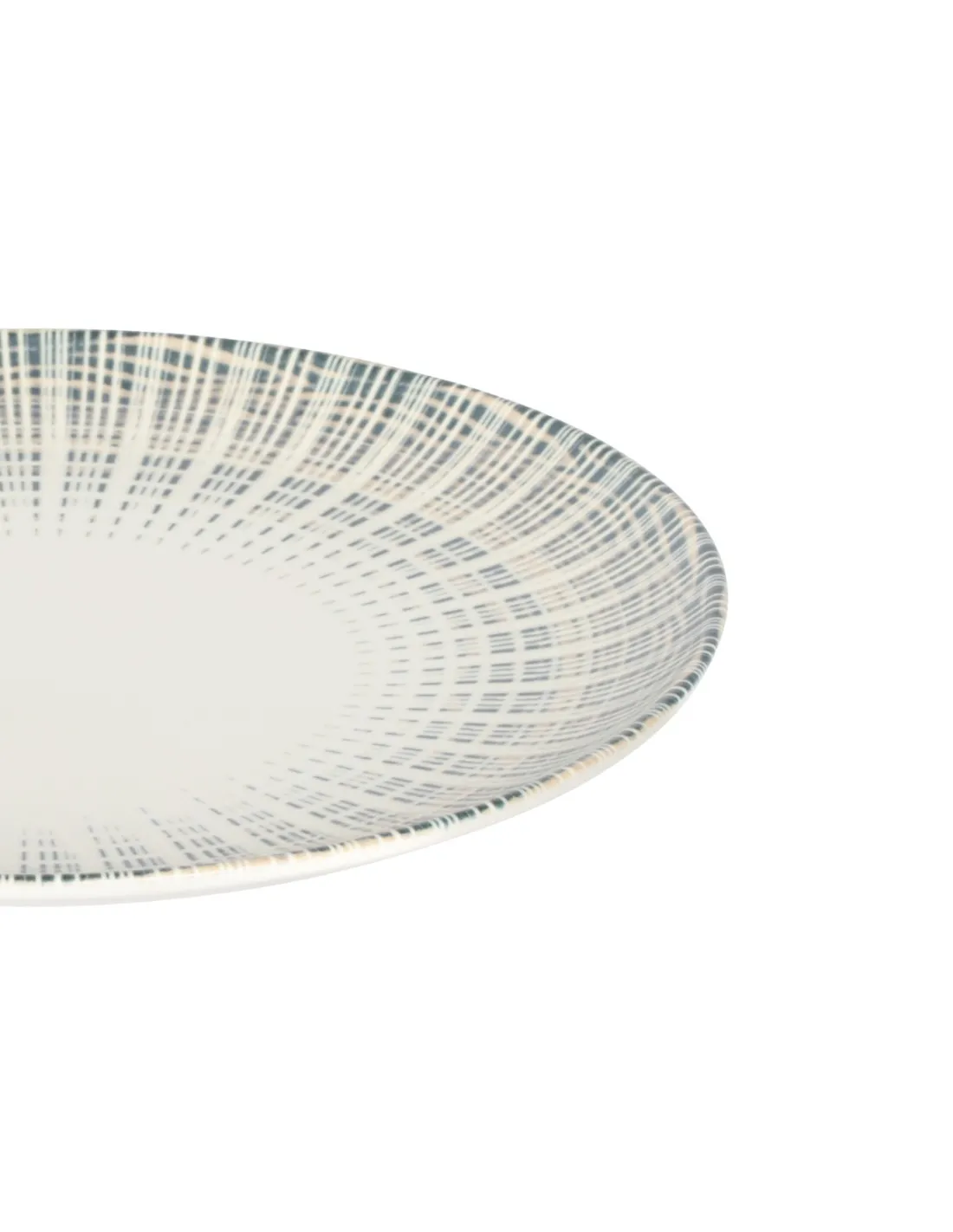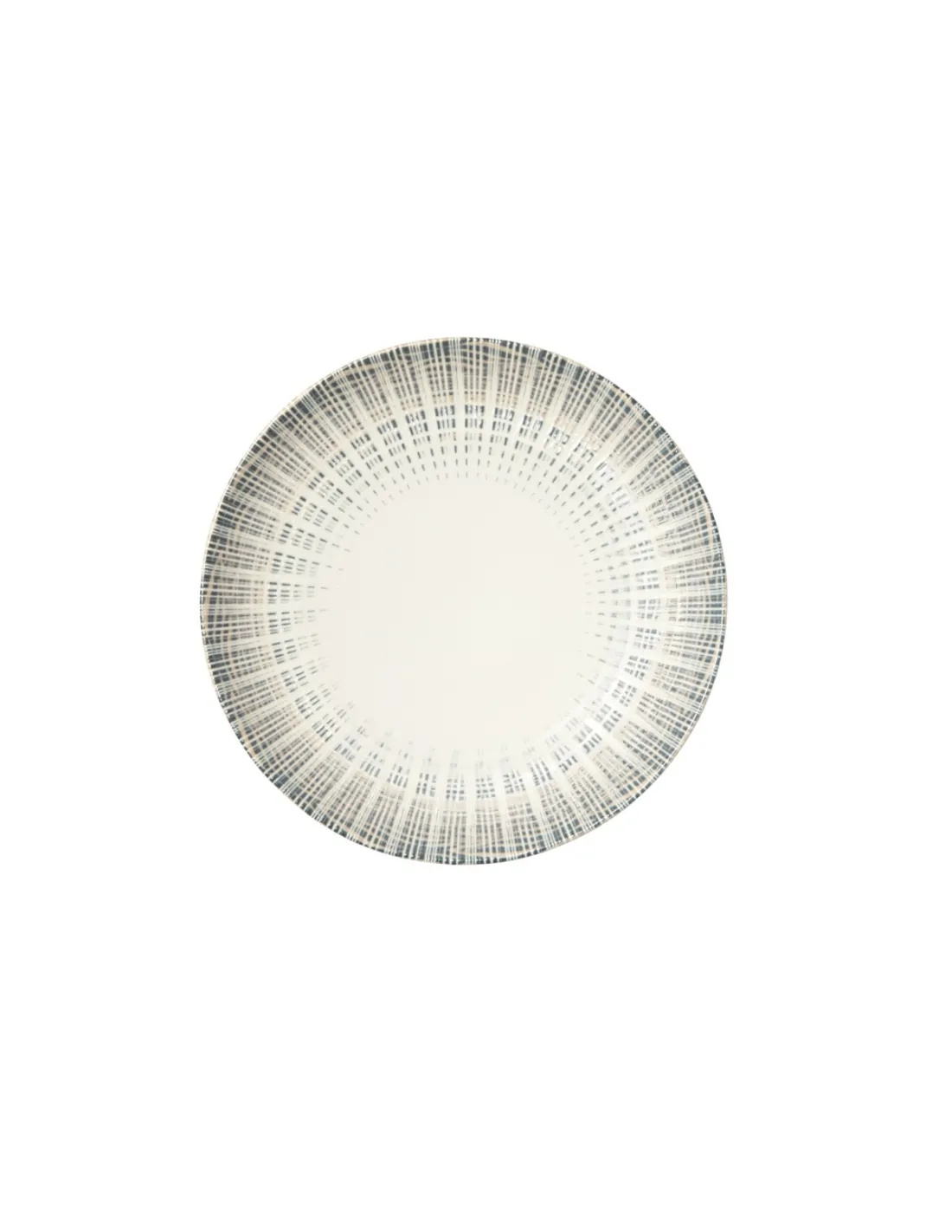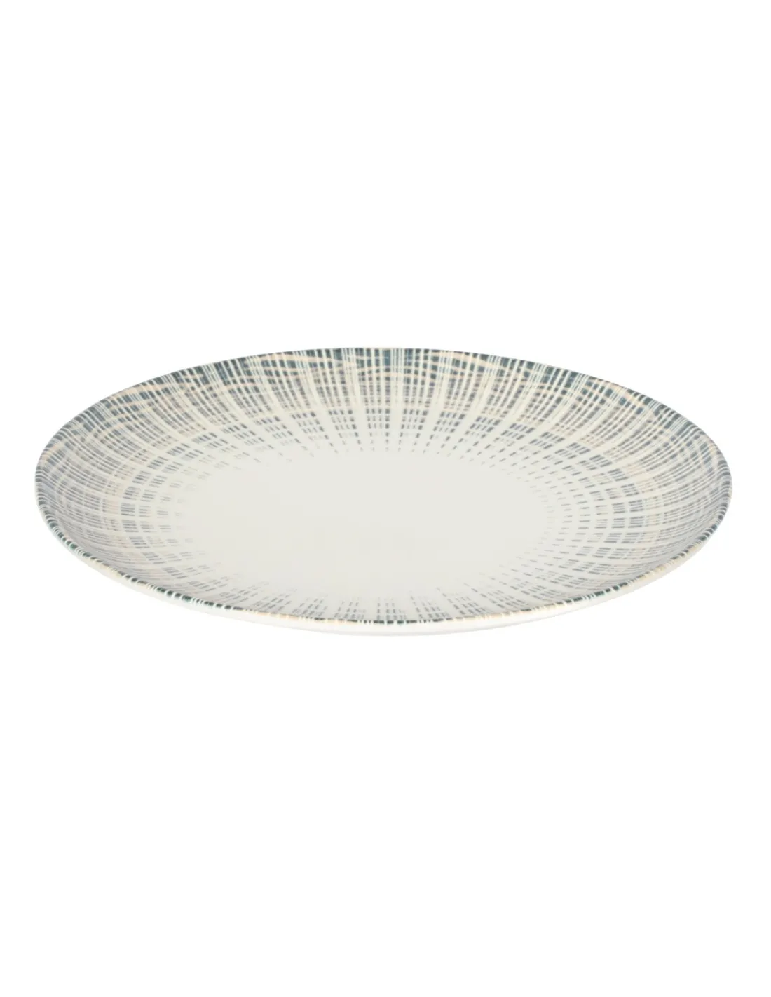 Round flat porcelain plate with a diameter of 27 cm, featuring a modern design in dark blue and beige. Resistant, stackable, dishwasher and microwave safe, suitable for professional catering.