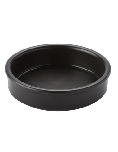 Catalan round black terracotta plate with a diameter of 11.5 cm. Designed for use in cooking and food presentation. Category: tableware.
