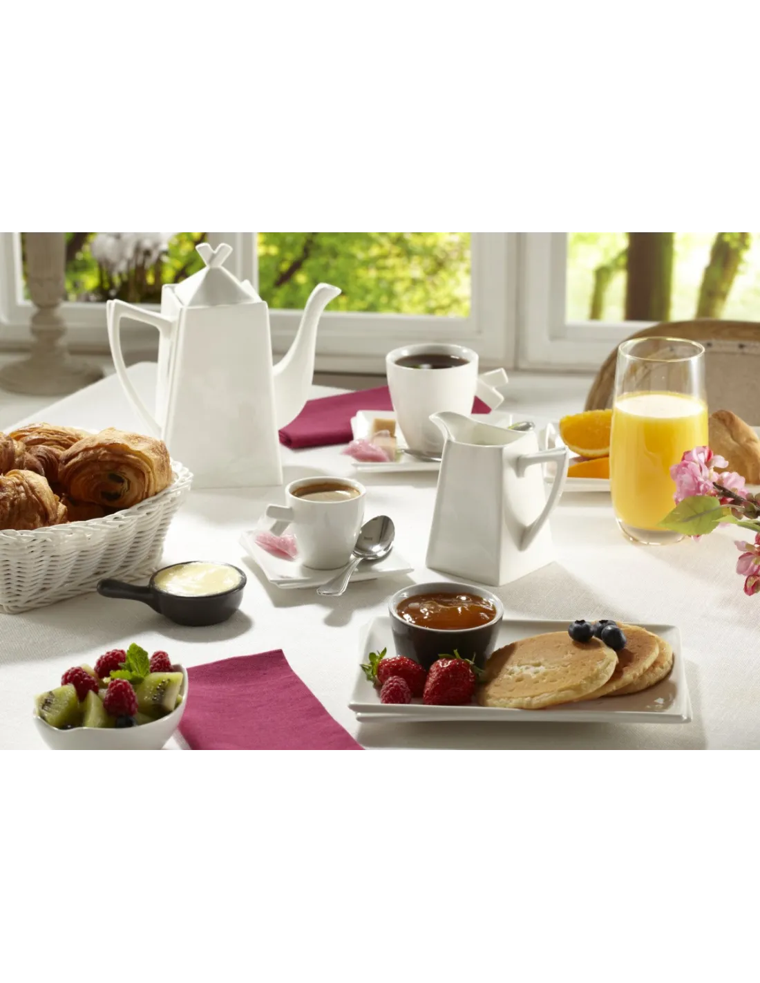 The white rectangular porcelain plate 15x21 cm Twins Pro.mundi is designed for hospitality professionals. It combines modern design, sturdiness, and practicality, thanks to its stackable nature, making storage easier. The durable porcelain can withstand temperature variations and frequent washing, making it ideal for daily use in cafés, hotels, and restaurants. Its clean aesthetic enhances the presentation of dishes and offers great functionality.