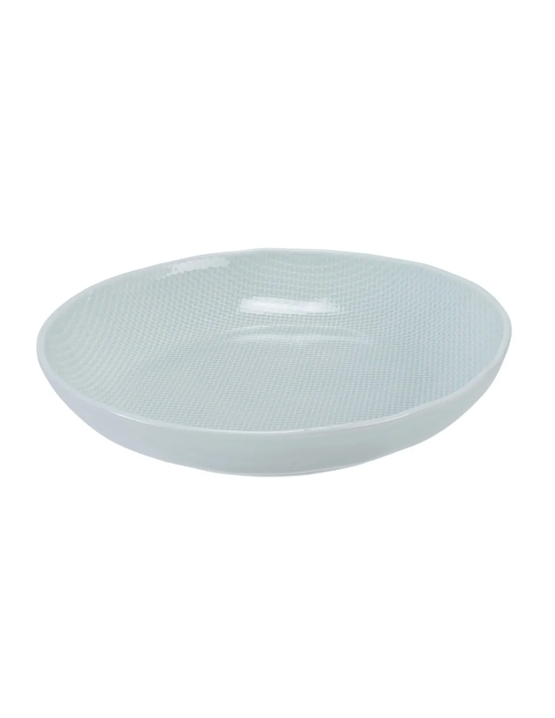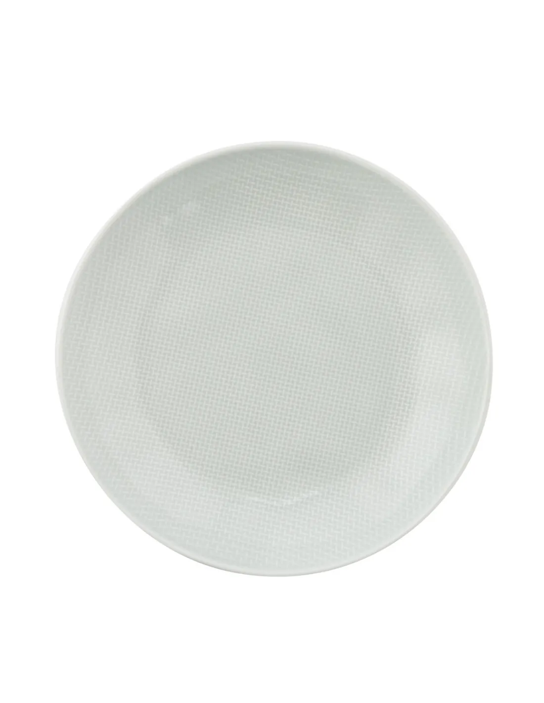 Round deep stoneware coupe plate with a diameter of 23.5 cm. It features a textured textile effect finish in green, with a contemporary silhouette.