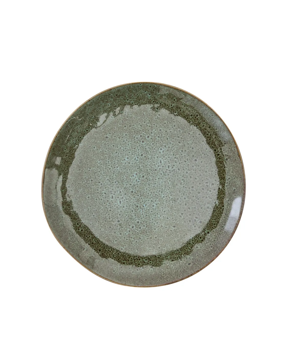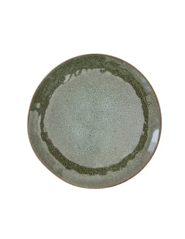 Round flat plate made of glazed green stoneware, 28 cm in diameter, from the Sky collection. Its sturdy and organic design makes cleaning easy, microwave-safe and stackable, suitable for...