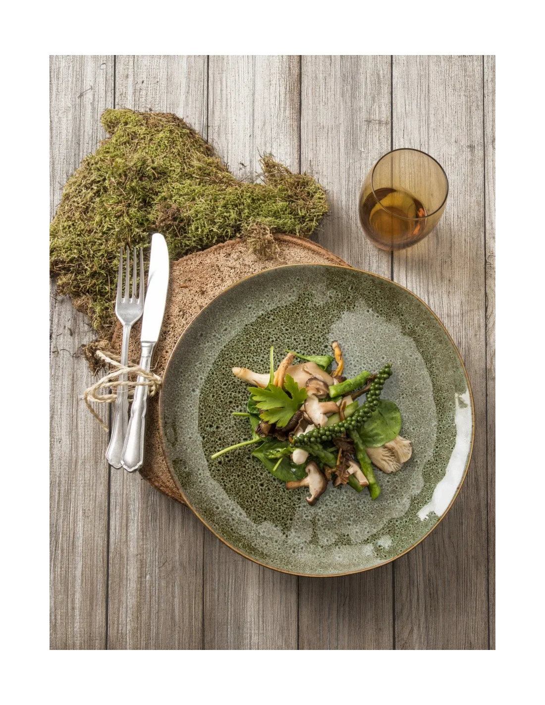 The 24 cm round green glazed stoneware flat plate Sky from Pro.mundi combines retro design, robustness, and practicality. Shock-resistant, easy to clean, microwave-safe, it is ideal for catering. Its glossy finish and green color add a sophisticated touch to every presentation. The Sky range, with its unique shades, allows for creating a current and timeless decoration in any professional establishment.