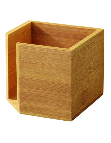 The Pro.mundi natural bamboo dispenser, 12 x 12 x 10 cm in size, is designed to organize the presentation of folded napkins on a buffet, side table, or service area. Its square and compact design allows for discreet integration in small spaces. Made of bamboo, it offers a stable and lightweight structure, suitable for small disposable napkins used in breakfast services, cocktails, or coffee breaks. The dispenser is open at the top, providing direct and quick access to the contents. Its simple design ensures good stability on the table, minimizing the space occupied. Maintenance is done with a damp sponge. In case of greasy residues, it is recommended to use white vinegar. Hand washing is advised to preserve the material's appearance. This dispenser is suitable for professionals looking for a practical and space-saving solution to maintain the order and accessibility of napkins in a service environment.