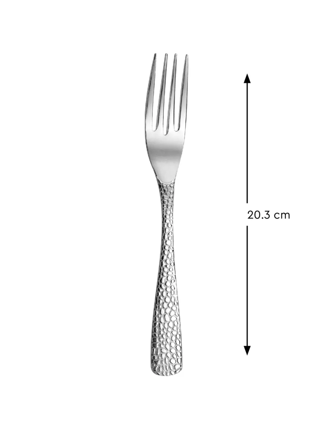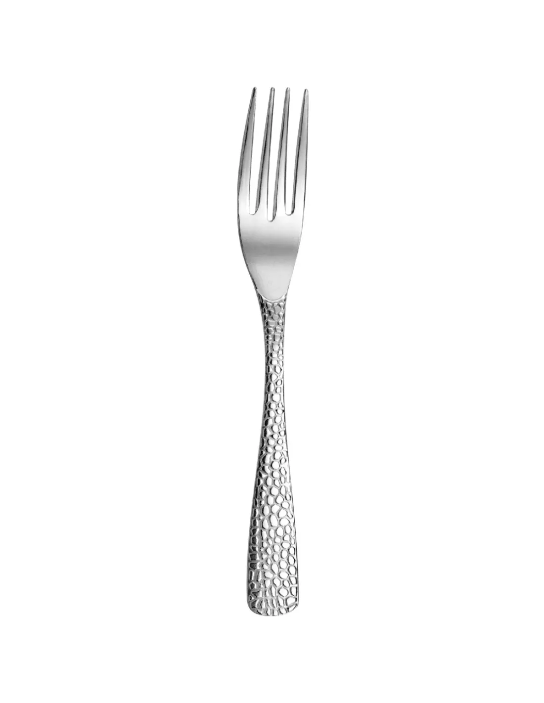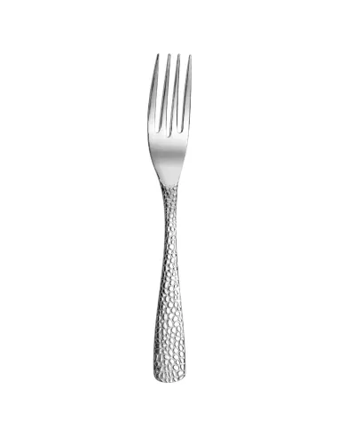 The 20.3 cm 18/0 stainless steel table fork features an original design with a hammered handle, offering robustness and easy maintenance for intensive use in the hospitality industry. Its...