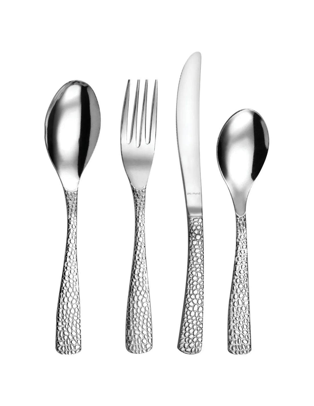 The Yum 18/0 20.3 cm stainless steel table fork Pro.mundi combines an original design with its hammered handle, robustness, and easy maintenance, making it ideal for intensive use in the hospitality industry. Its corrosion resistance, sturdiness, and discreet aesthetics make it a versatile and economical choice, suitable for professionals who care about quality and presentation.
