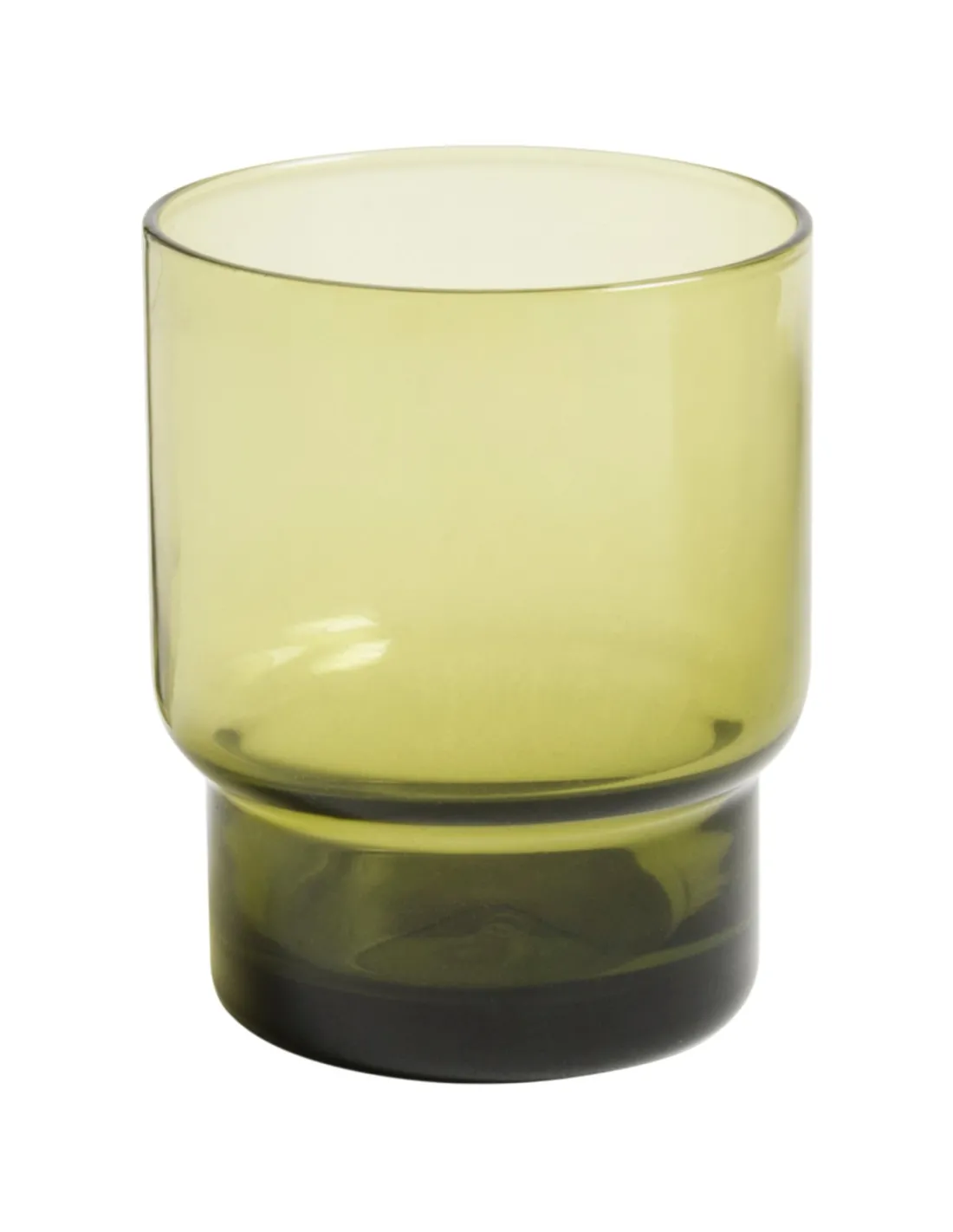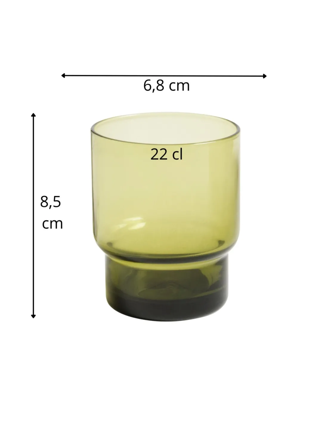 Low green glass tumbler, 22 cl, stackable and durable. Designed for catering professionals, easy to clean and compact, optimizes space and brings modernity to tables.