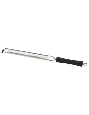 Stainless steel grater, 40 cm long, with an ergonomic thermoplastic elastomer handle and non-slip base. Useful surface: 22 x 3.5 cm. Designed for grating cheese, chocolate, and vegetables.