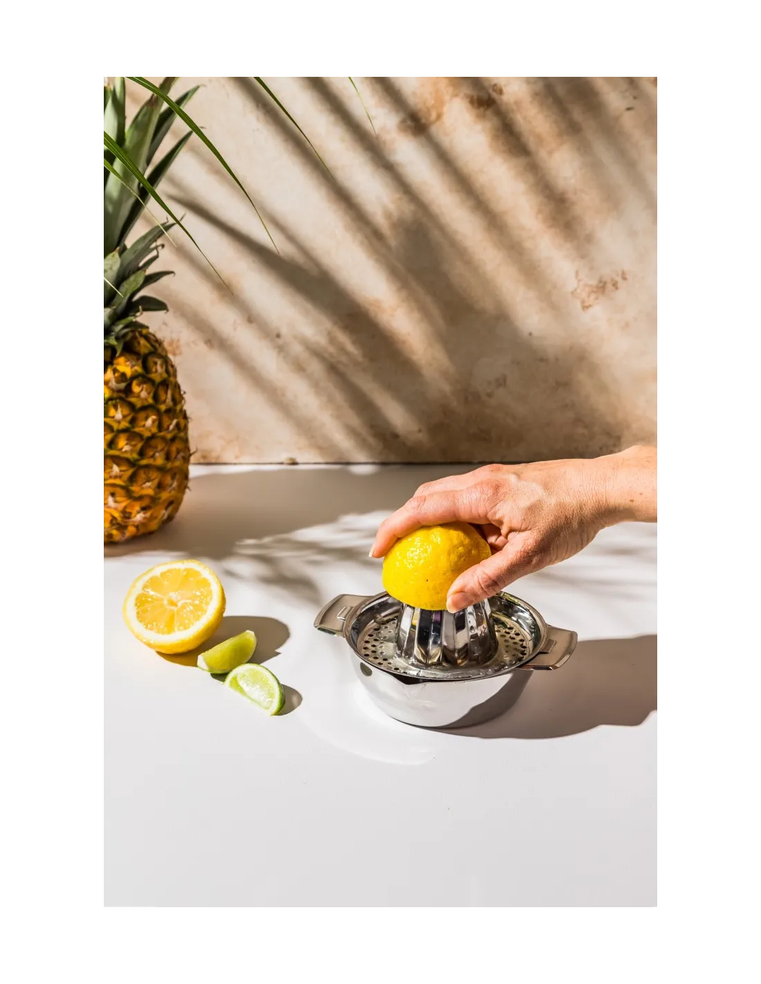 Stainless steel juicer with a diameter of 12.5 cm, designed to efficiently and durably extract juice from fruits.