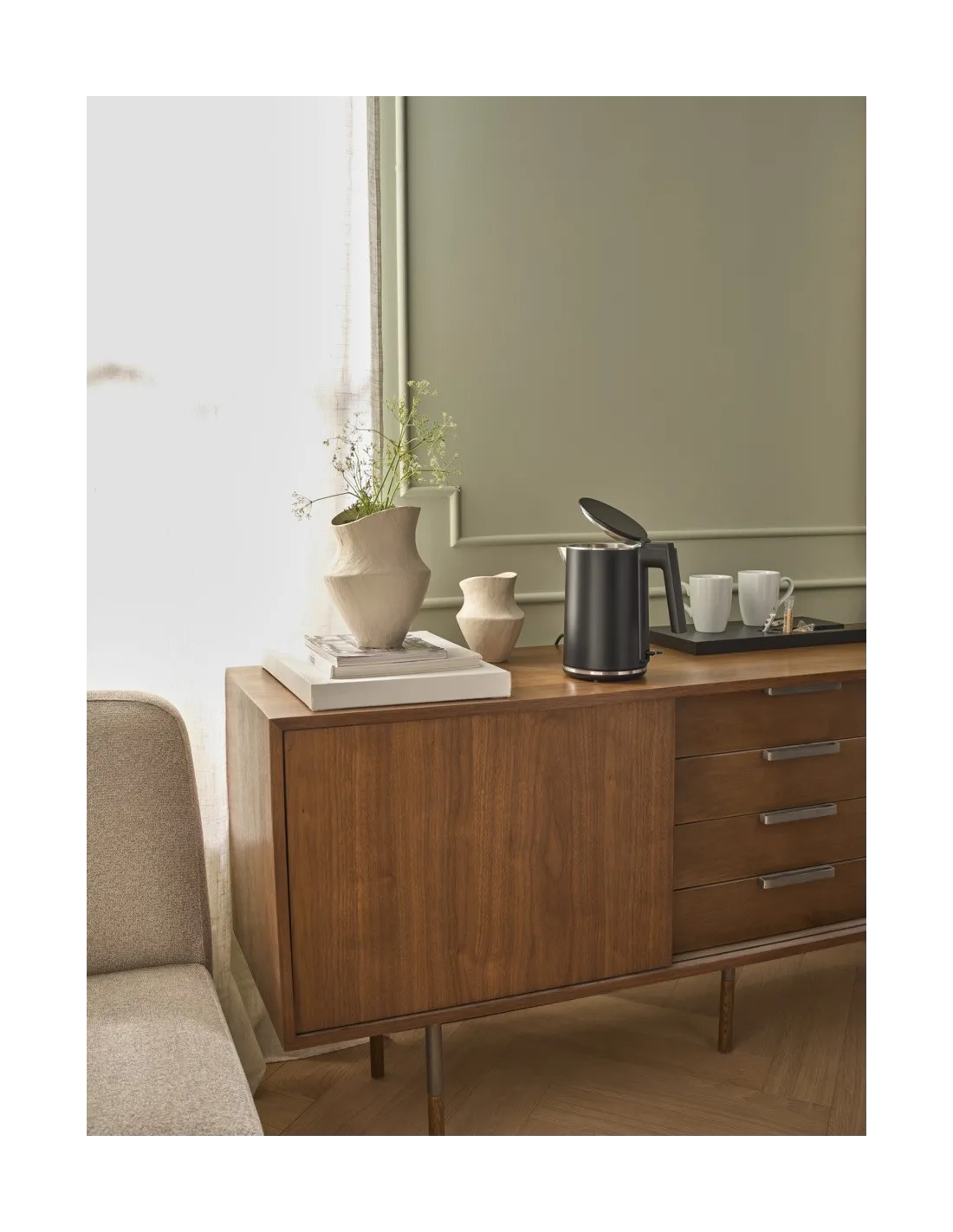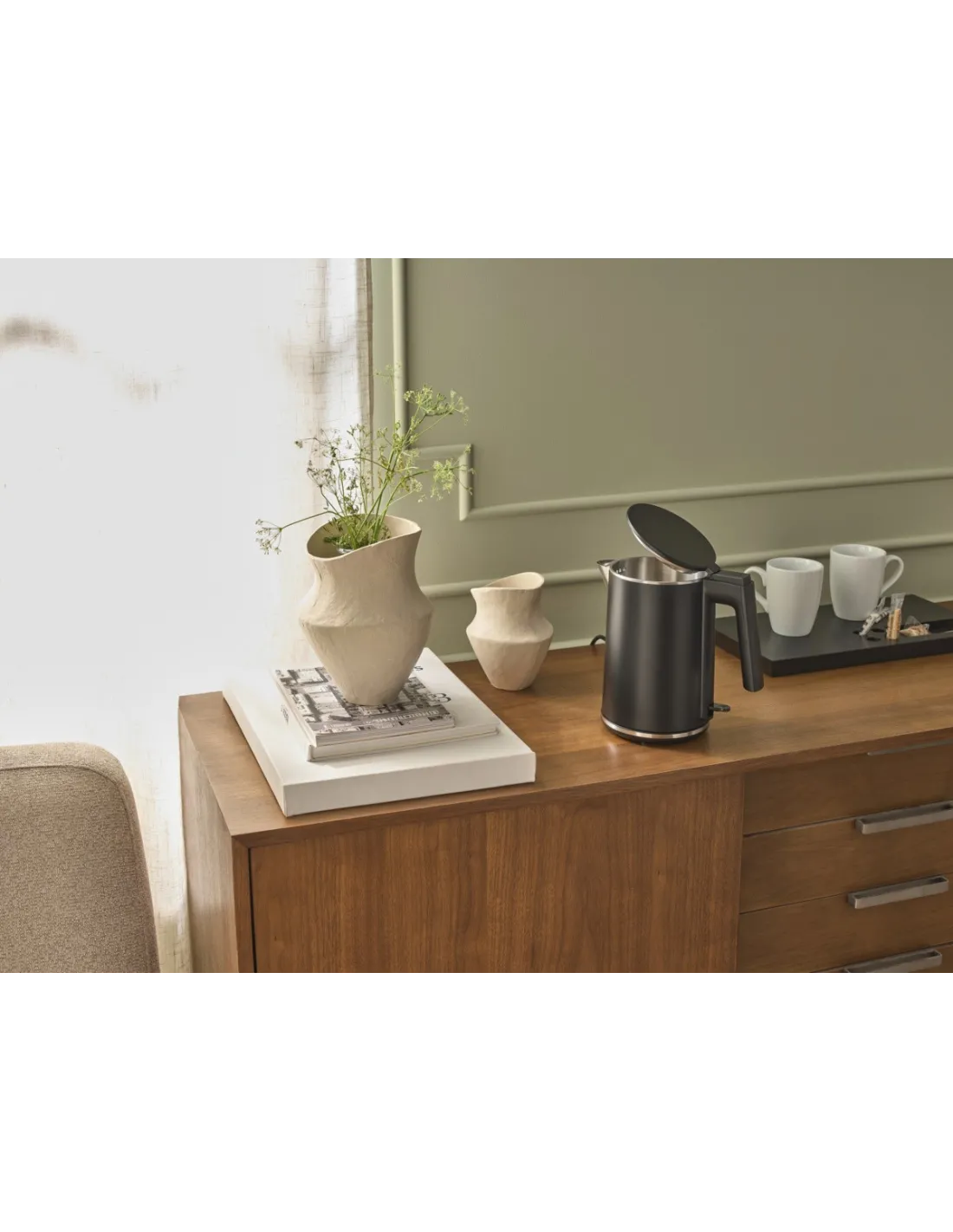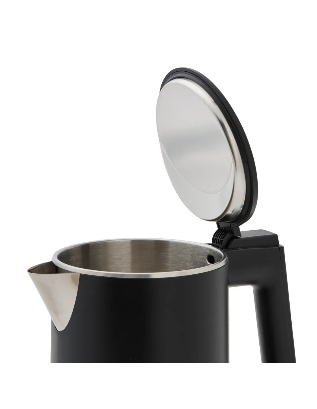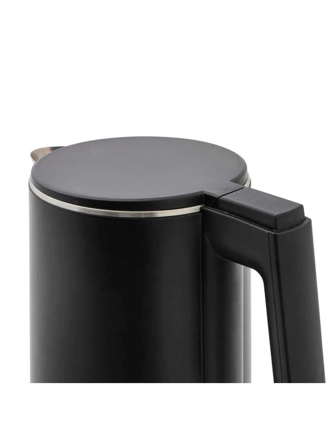 The 1500 W matte black electric kettle has a 1-liter capacity and is made of double-walled stainless steel. Its design suits various decorations and features an ergonomic handle for safe handling....