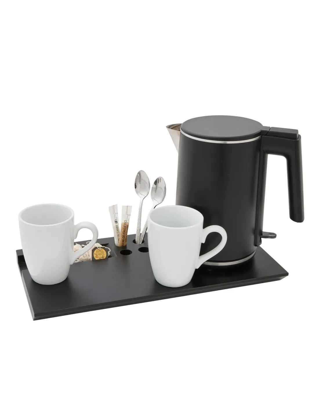 The black 1L BULLY electric kettle from Pro.mundi is ideal for restaurants and hotel rooms. With its 1-liter capacity and double-walled stainless steel construction, it allows for easy preparation of hot beverages. Its matte black design blends in with any decor and its ergonomic handle ensures safe handling. Equipped with dry boil protection and automatic shut-off, it is easy to use with its light indicator. Compact and practical, it meets the needs of customers.