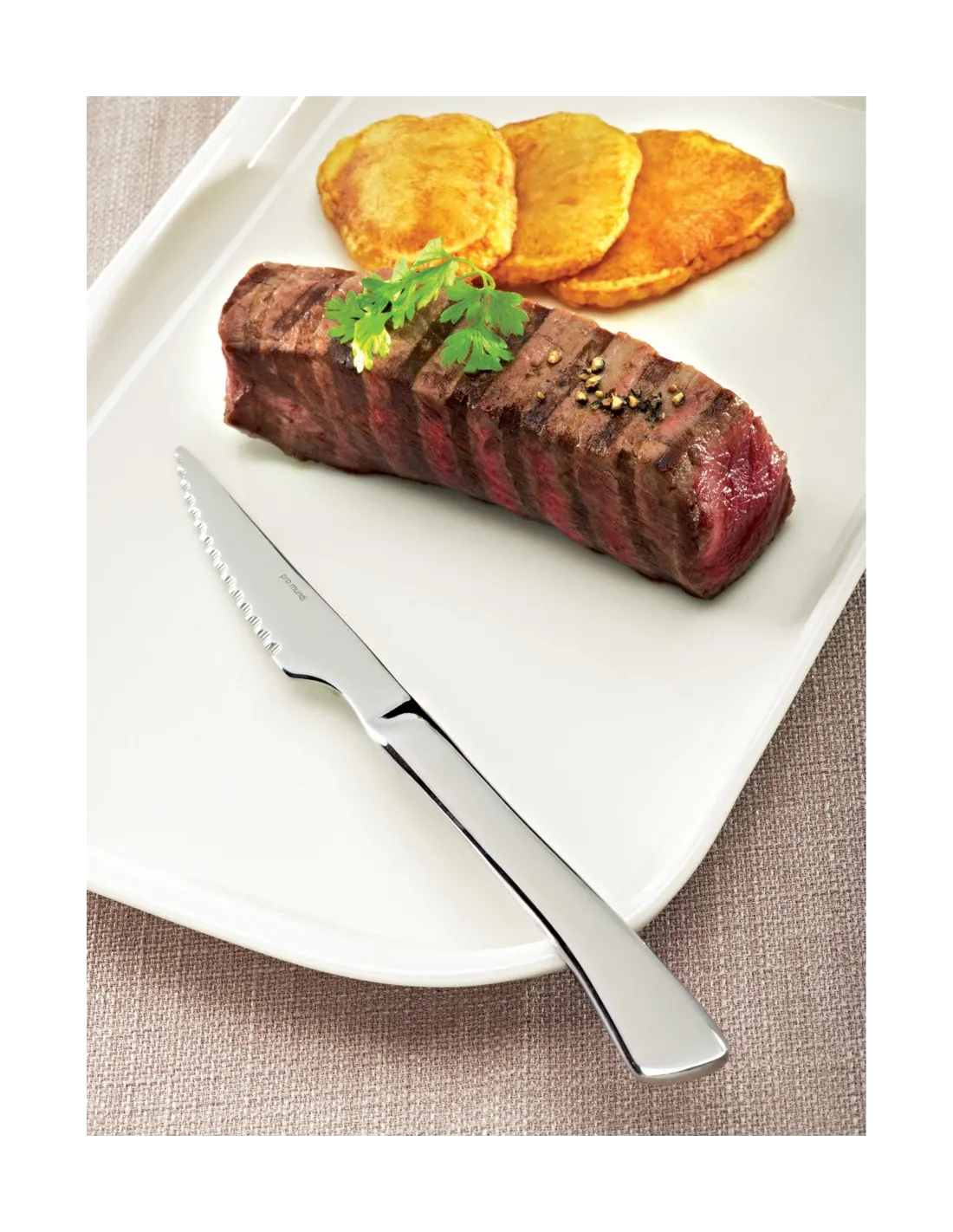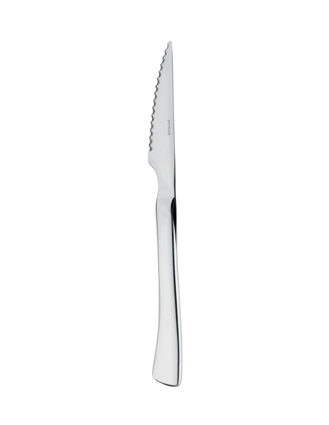 Pro.mundi offers a 22.4 cm Shark steak knife, which combines performance and comfort. Its micro-serrated blade in 13Cr stainless steel ensures a precise and durable cut, ideal for meats. The ergonomic handle provides a comfortable grip, while the sleek and elegant design suits all styles, making it perfect for professionals in the catering industry.