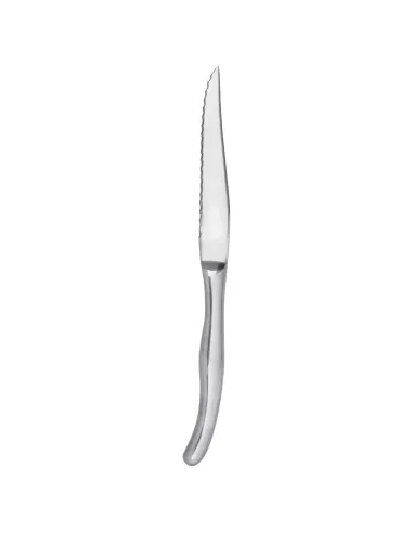 Pro.mundi offers a 23 cm steak knife with a streamlined design and a full stainless steel body, combining elegance, hygiene, and durability. Its 12.30 cm serrated blade in 13Cr stainless steel ensures precise and durable cutting. The ergonomic handle provides comfort and stability, ideal for restaurant professionals seeking style and performance.