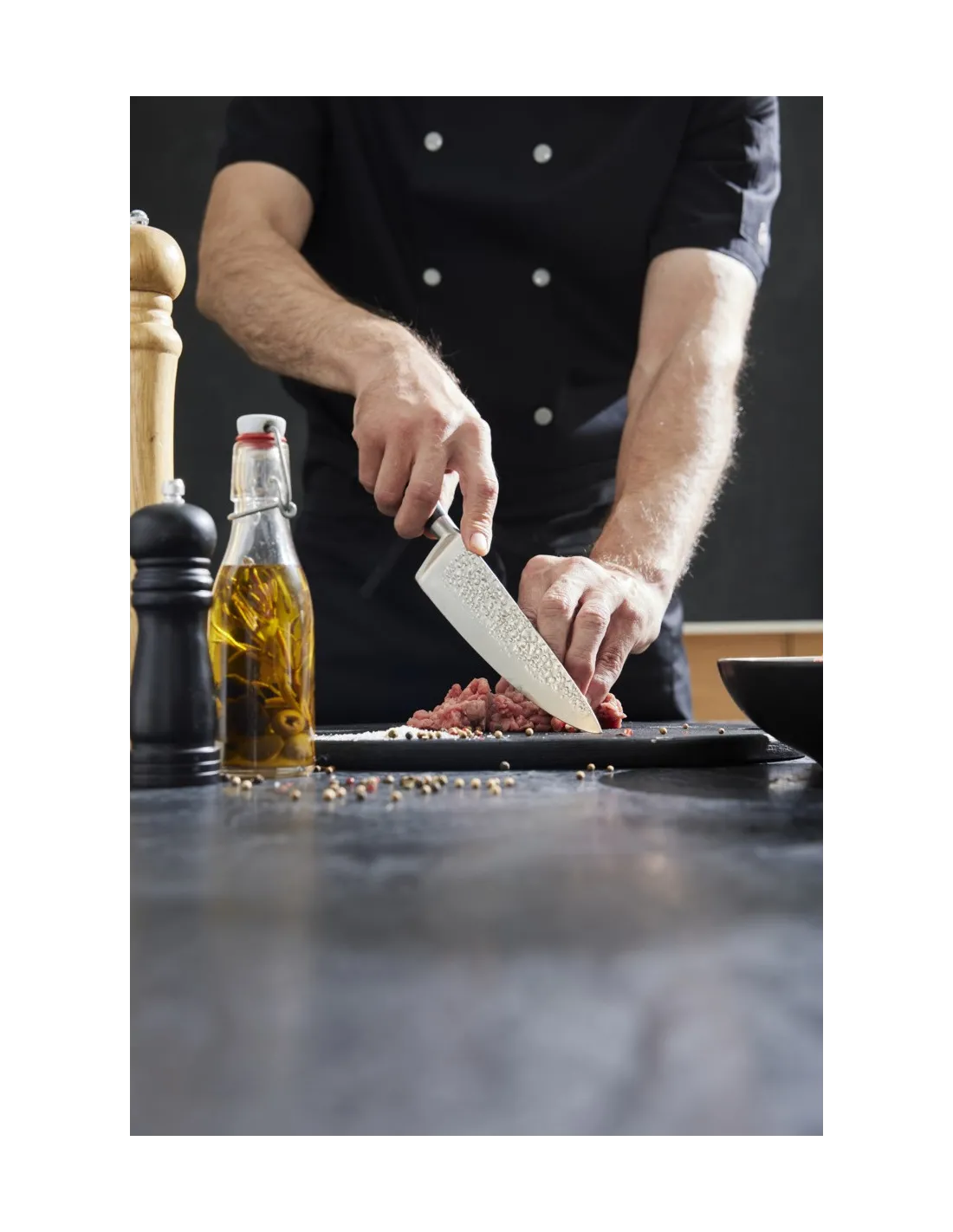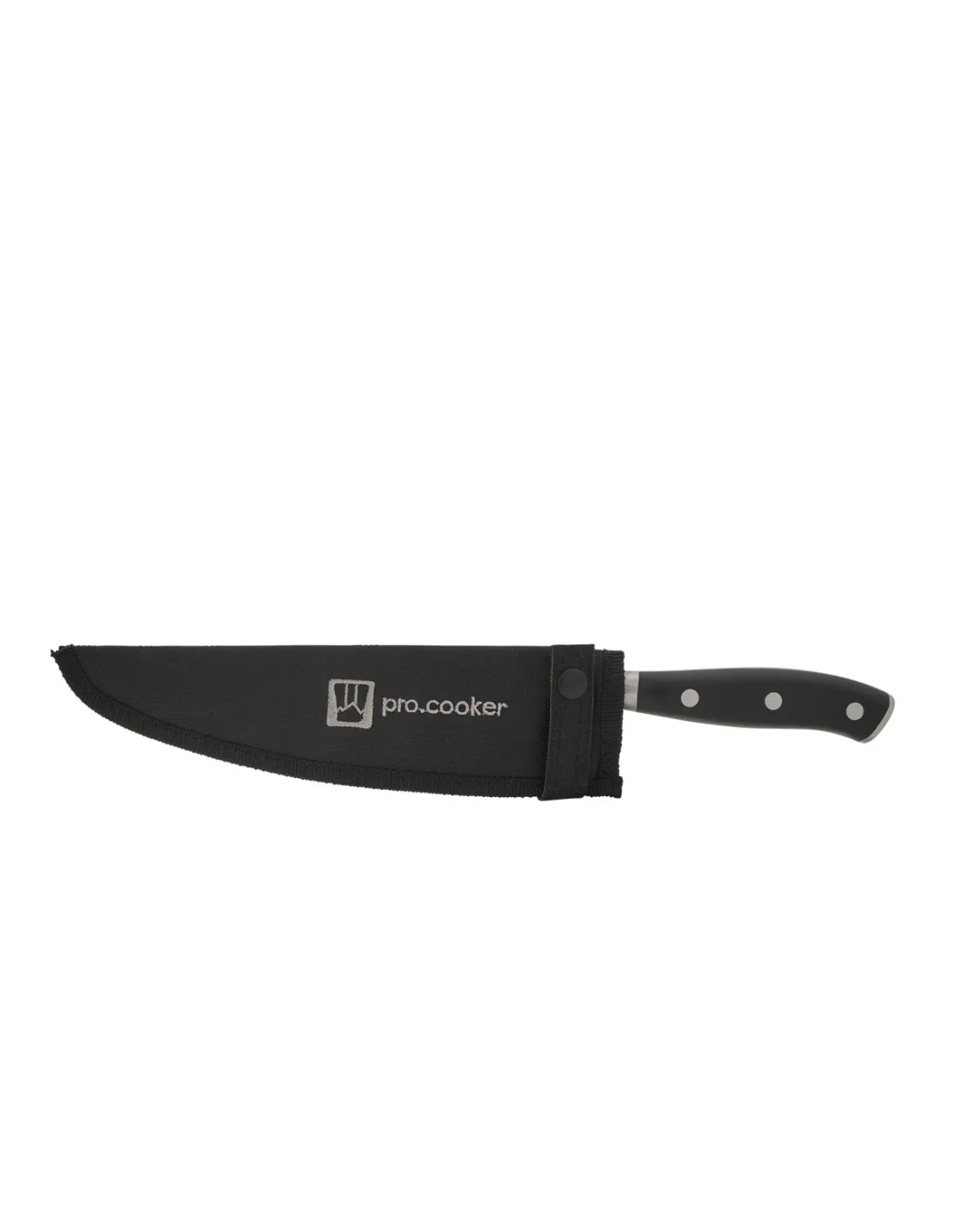 20 cm chef's knife with stainless steel blade and POM handle. Designed for professional use in the kitchen, it provides precise cutting and a comfortable grip. Includes protective cover.