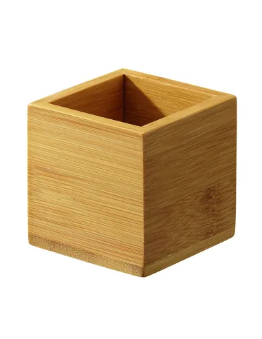 The square Pro.mundi natural bamboo container, measuring 6 x 6 x 6 cm, is designed to organize small service accessories such as toothpicks, stirrers, sugar packets, or single-dose items. Its compact size allows for easy integration on buffets, bars, or break tables without taking up space. Stable, lightweight, and easy to clean, it is suitable for hospitality professionals to neatly organize and access small service items.