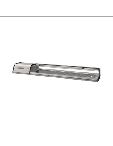 The compact silver sushi showcase features an exterior design with anodized aluminum profile and an interior tray made of stainless steel AISI 304. It includes a lift-up secured curved glass and high-pressure injected polyurethane insulation, free of CFCs, with a density of 40 kg/m3. The LED lighting on the top profile enhances product visibility. With a volume of 32.2L and dimensions of 1972 x 410 x 230 mm, it operates at a temperature of -1 / +1ºC. It includes a digital thermostat, manual defrost, and uses R134a refrigerant.
